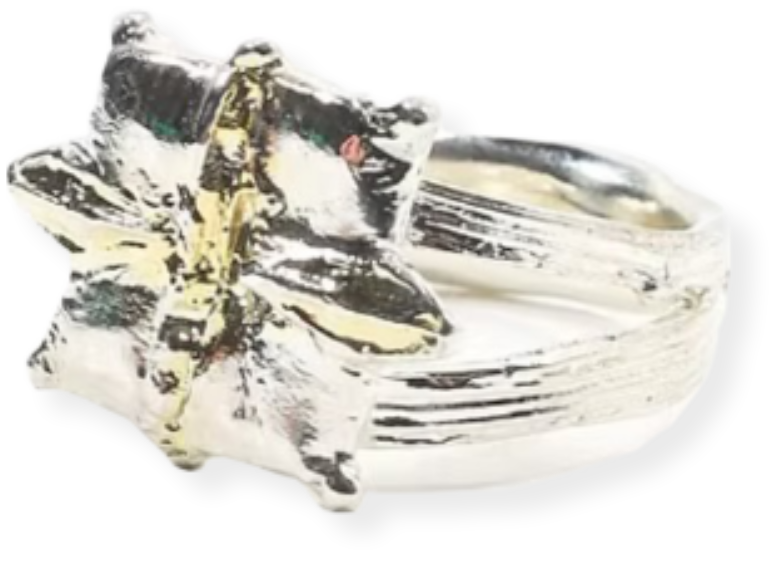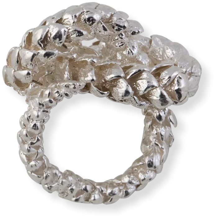 Dreamlike in aesthetic, the designs reveal texture left behind from the war flowers which were burnt into the metal surface. The flowers were picked from the new frontlines in Kyiv and eternalised in recycled precious metals. The collection is a symbol of hope and flourishing in a time of great upheaval; a reminder that while life may be fragile, it is resilient. Celebrating the creative voices of 6 Ukranian Muses behind the collection, who have the power to inspire and create.