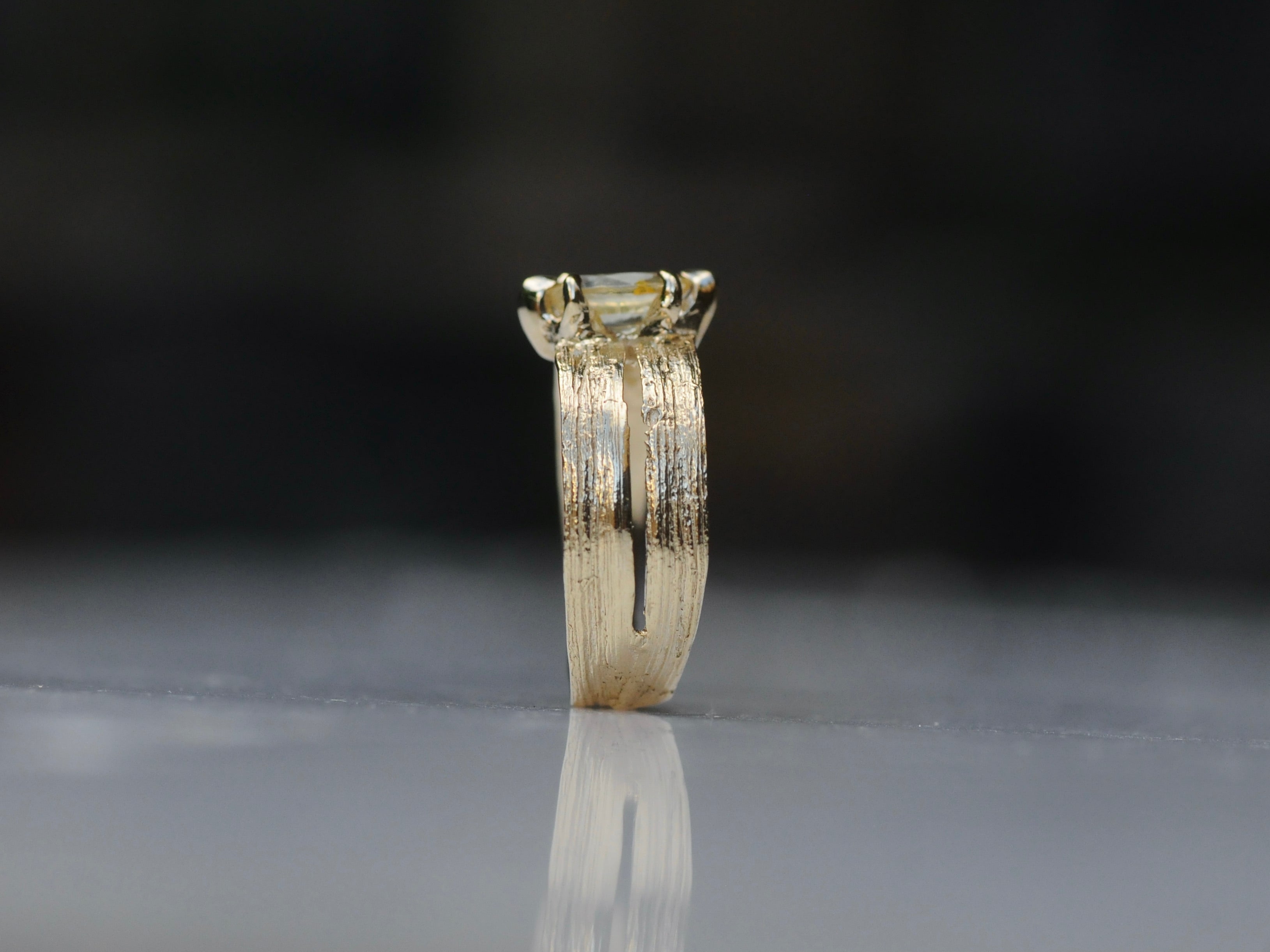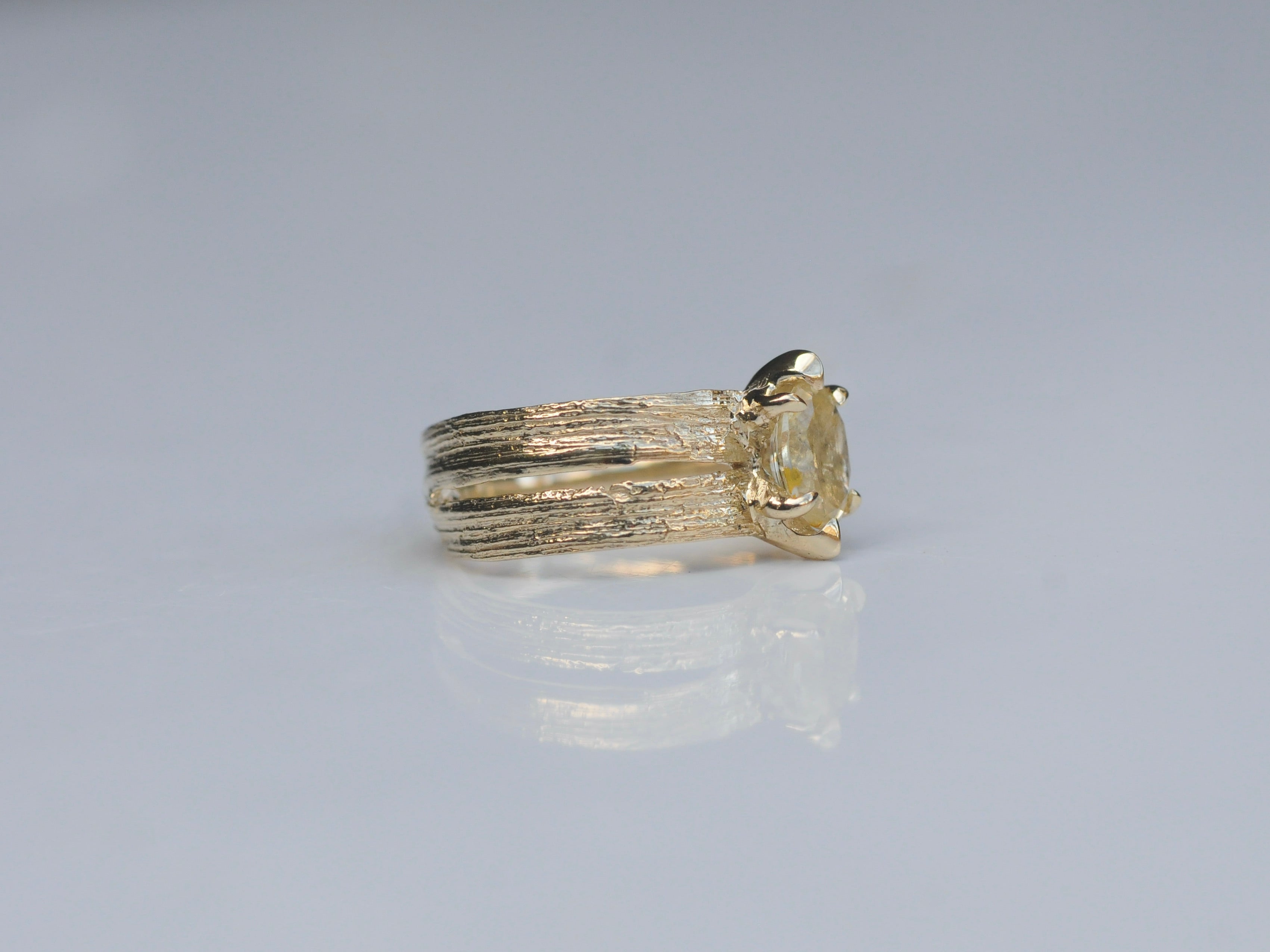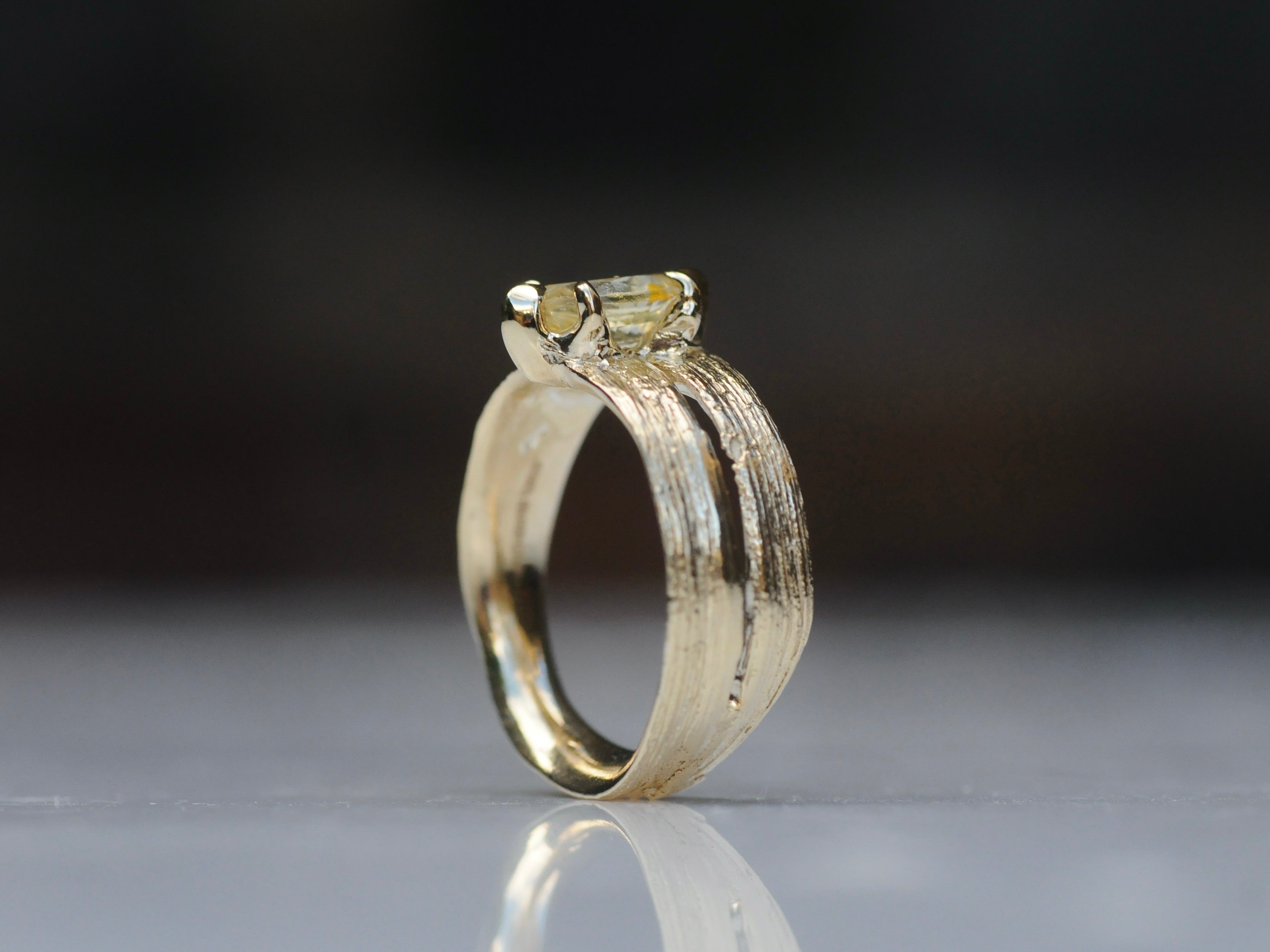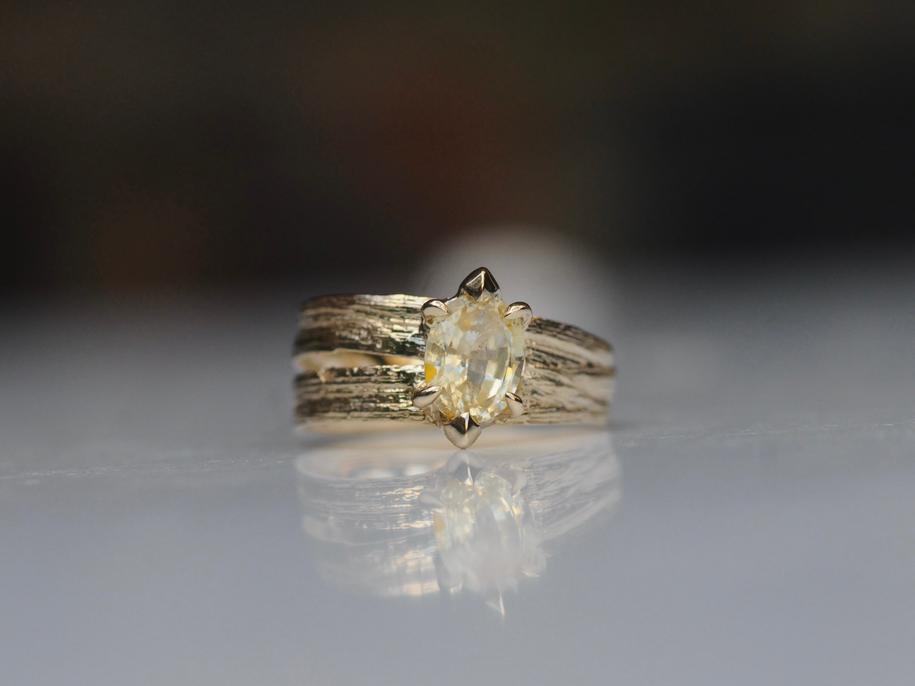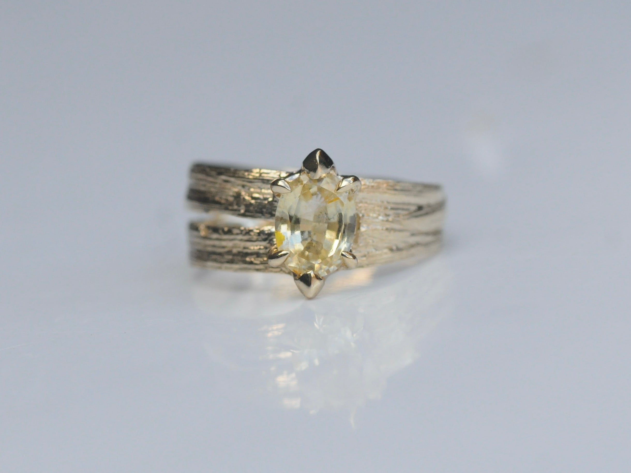 The ring was carved around this remarkable Sapphire - its colour shifting from deep honey to soft lemon, like light passing through flame. Set within a wrap of woven wild grasses, the form holds movement and stillness in equal measure.