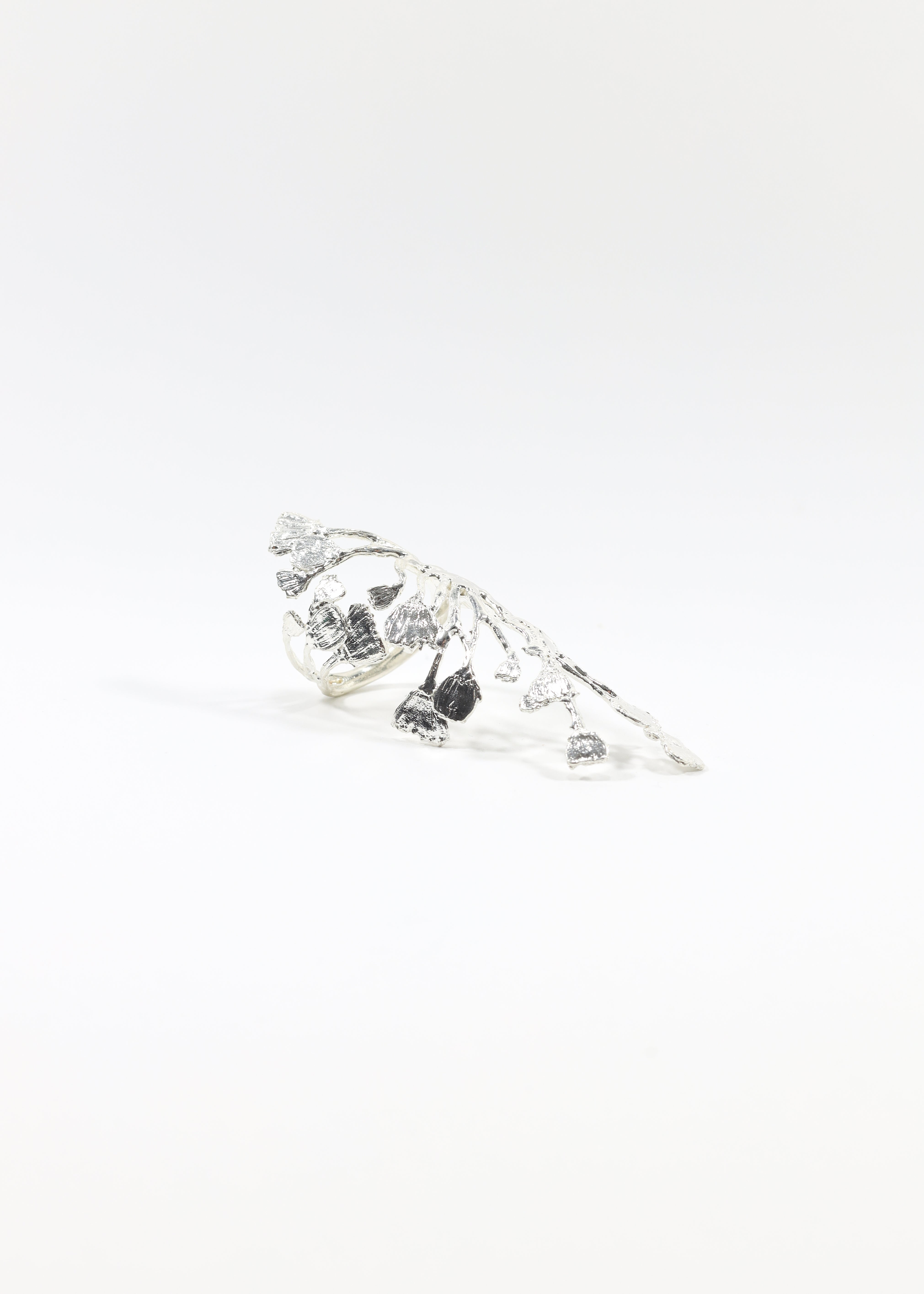 Flower Lace ring is designed to wrap along the index finger, made in 100% recycled sterling silver. Winding and weaving flowers up and along the hand, capturing the first moment of spring. This ring is both delicate and versatile, whilst packing a high statement.