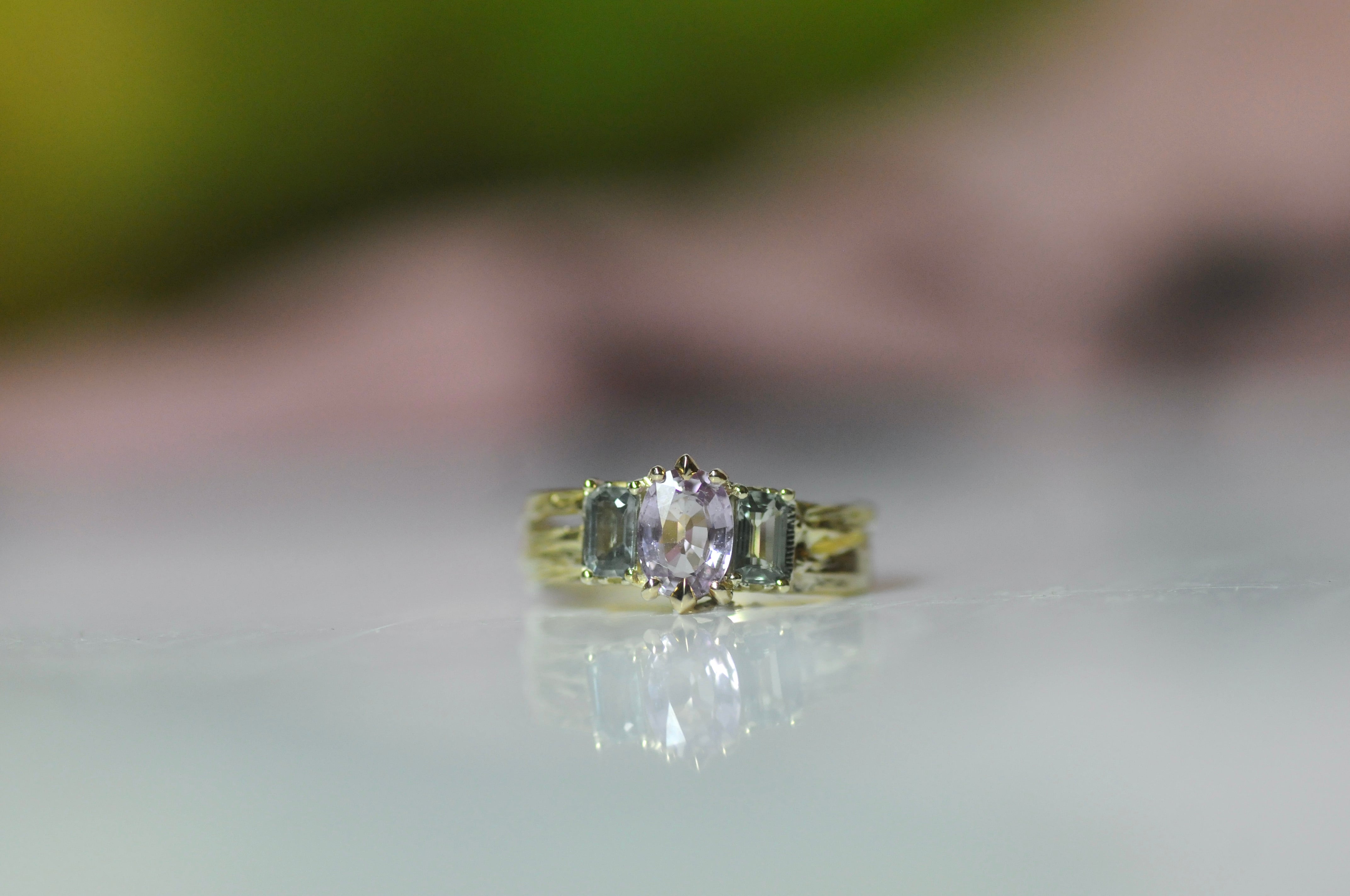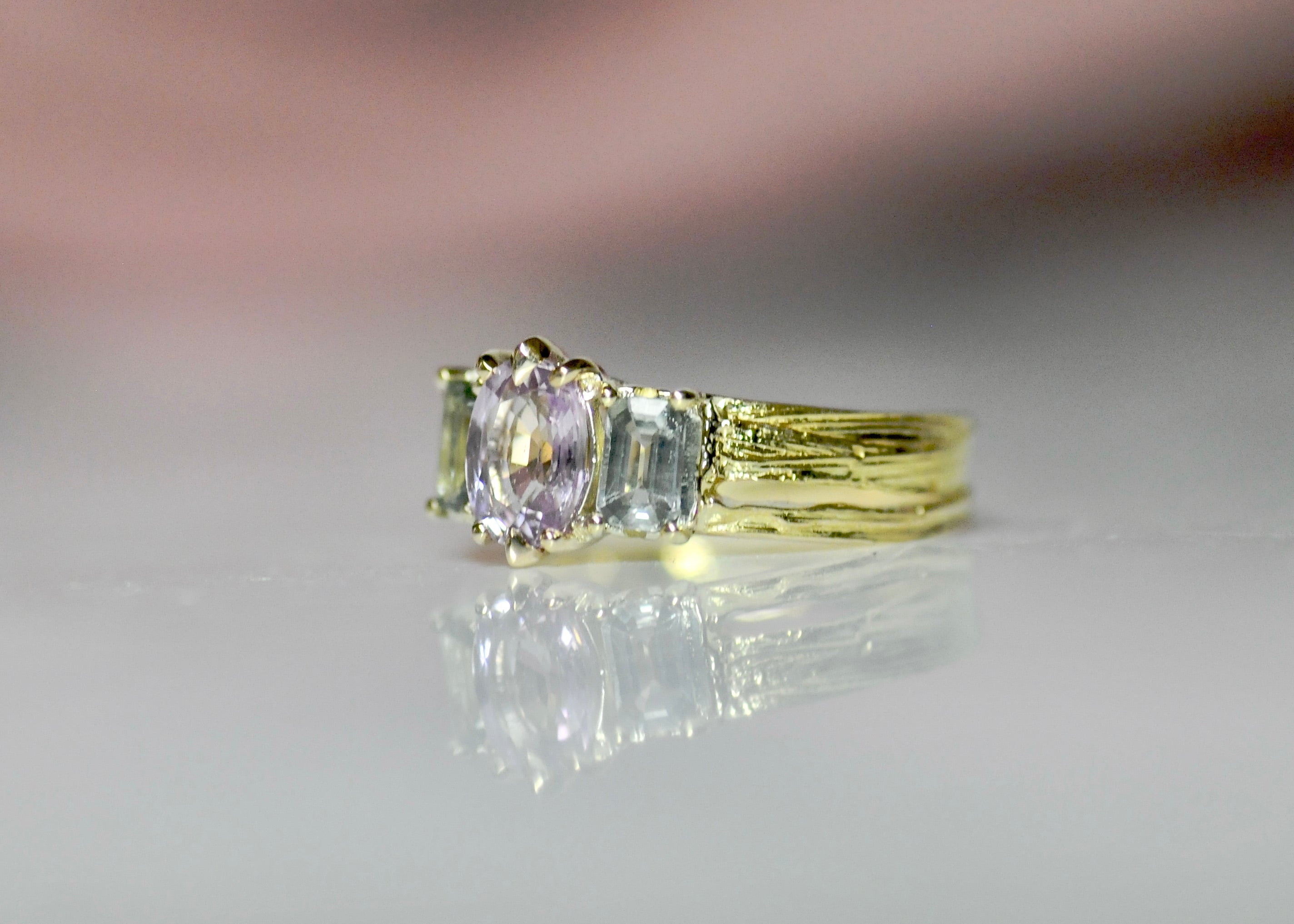 Soft pink and green sapphires shimmer like sunlight over gentle fields — a celebration of movement, memory, and place.