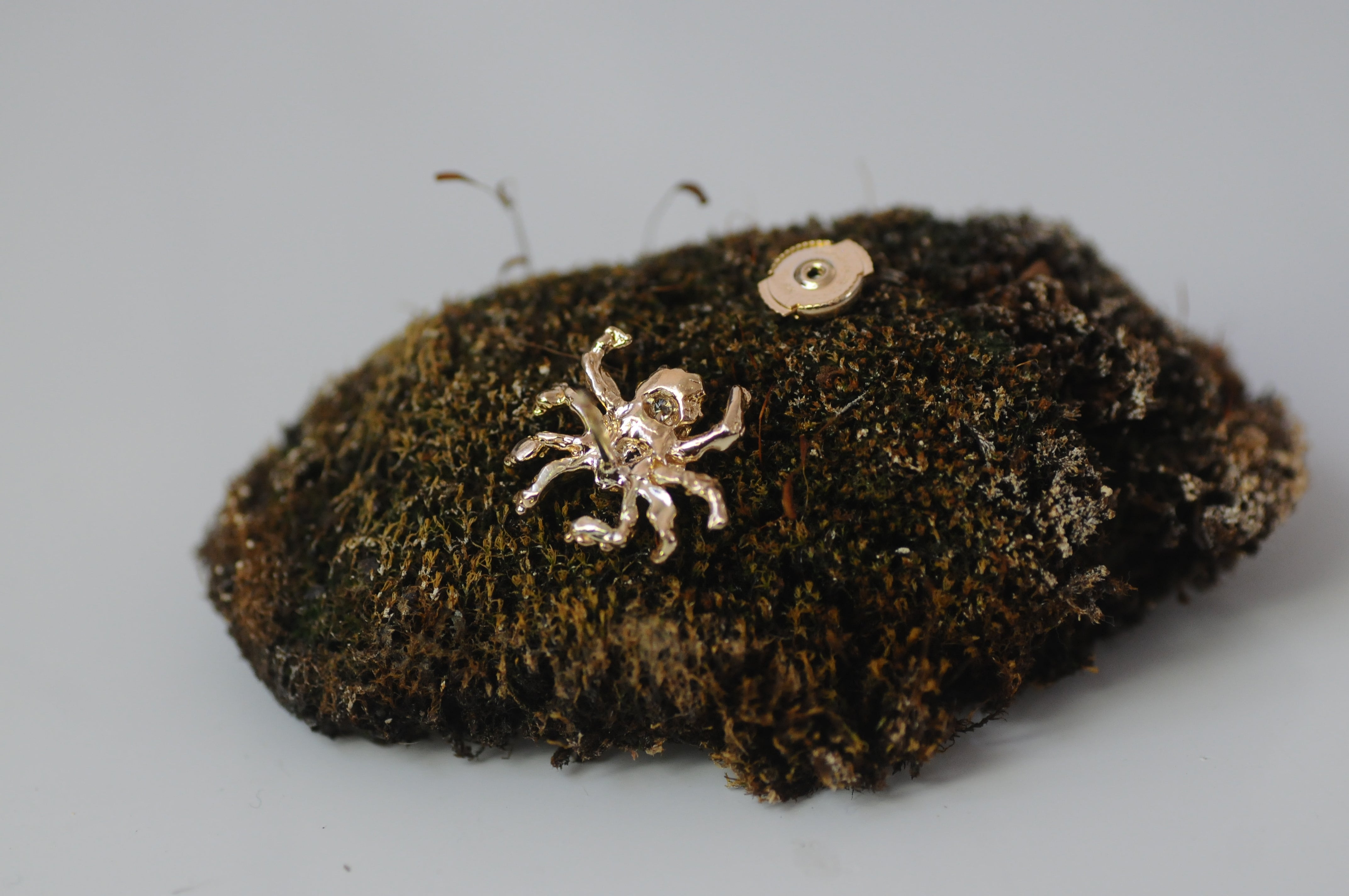 A one-of-a-kind piece created for Dave, affectionately known as Spider. Hand-carved in recycled 9ct yellow gold, this pendant features rich ruby and diamond details and a protective “guardian” back.