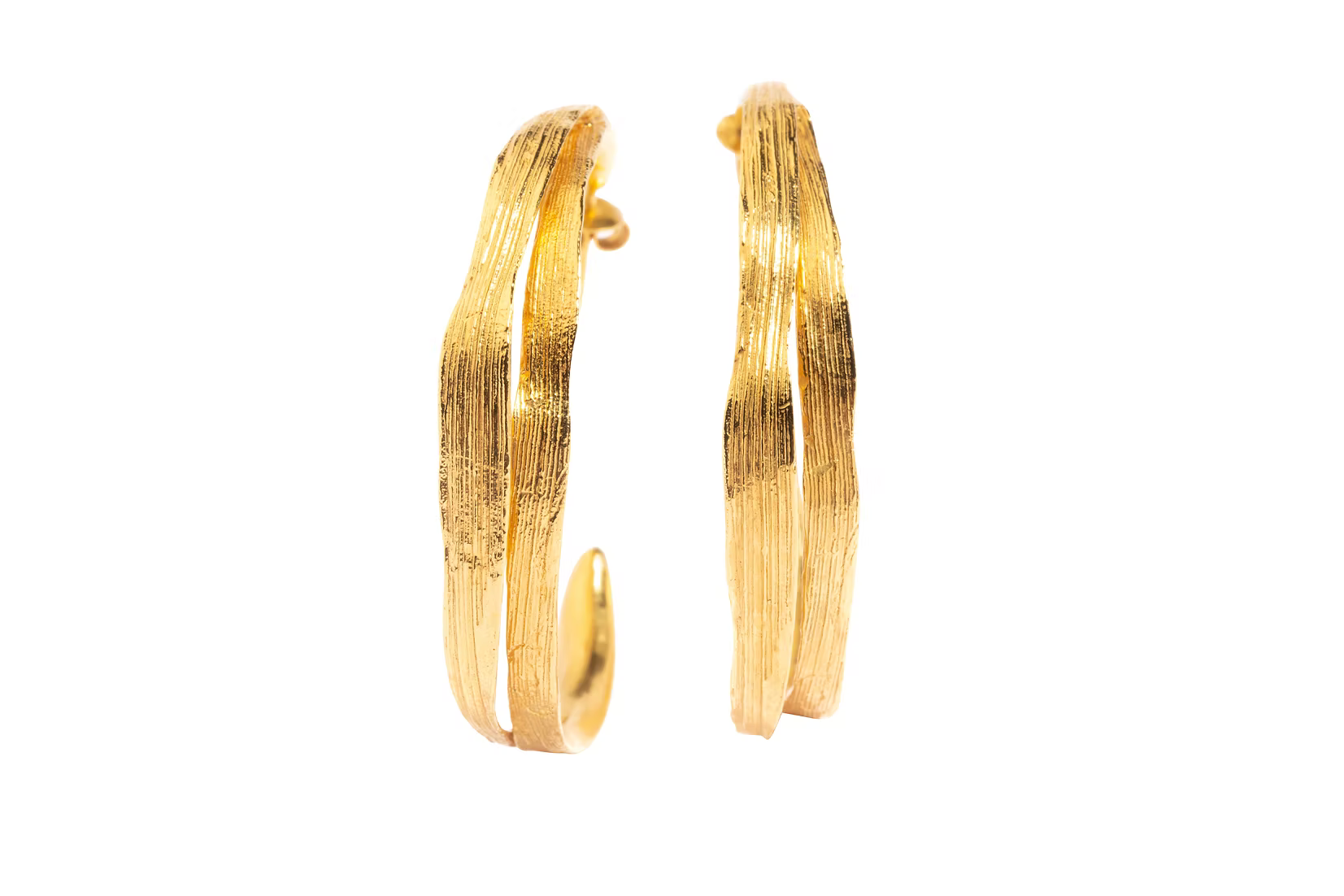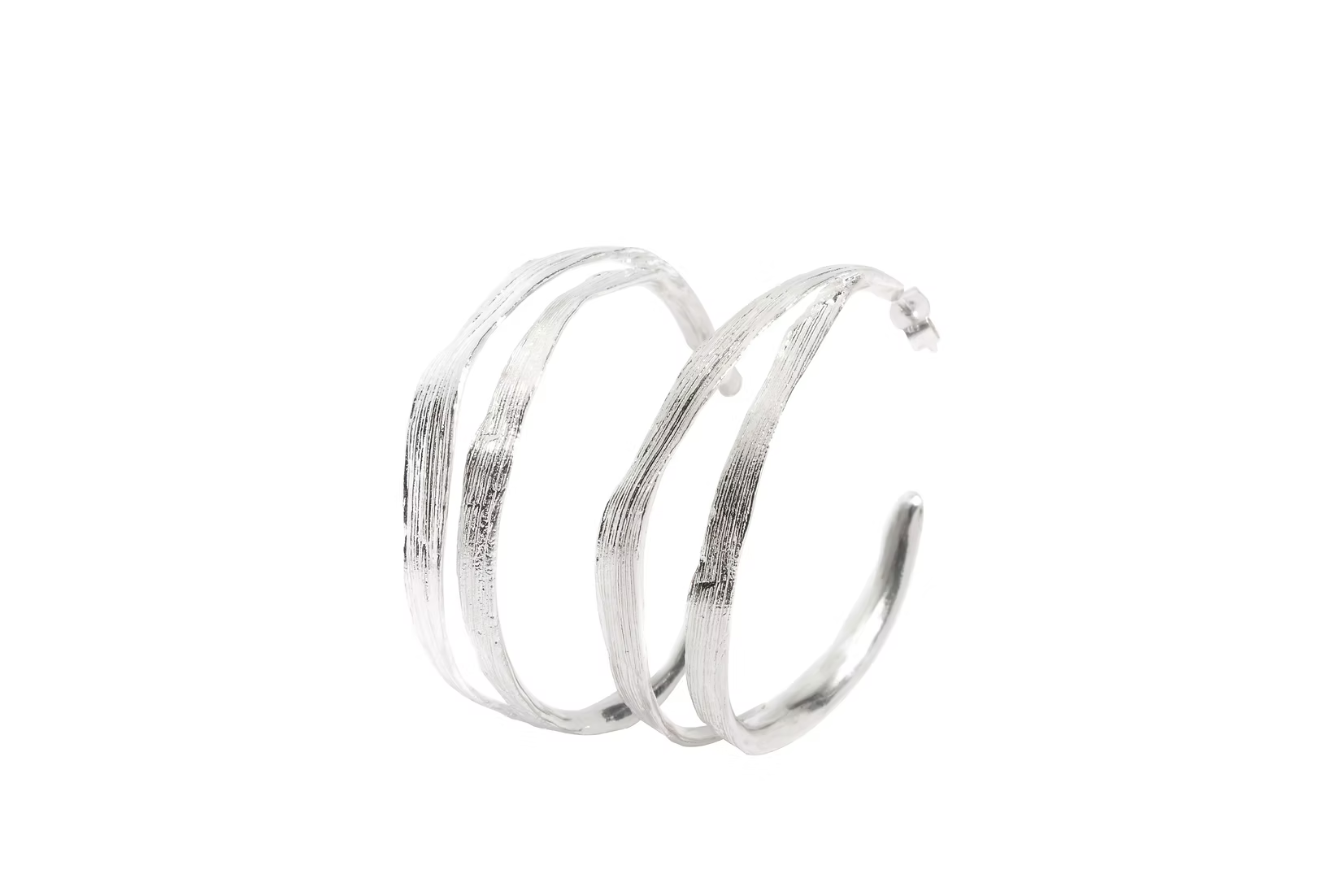 The Ancients are a contemporary take on the Classic Hoops. Featuring an asymmetrical wrap of our signature grass blade texture, these mighty hoops deliver a statement, casting great shapes and movements. Made from a delicate fold of carefully selected grasses, they have been dried and developed in wax, before lost wax casting into precious recycled metals.