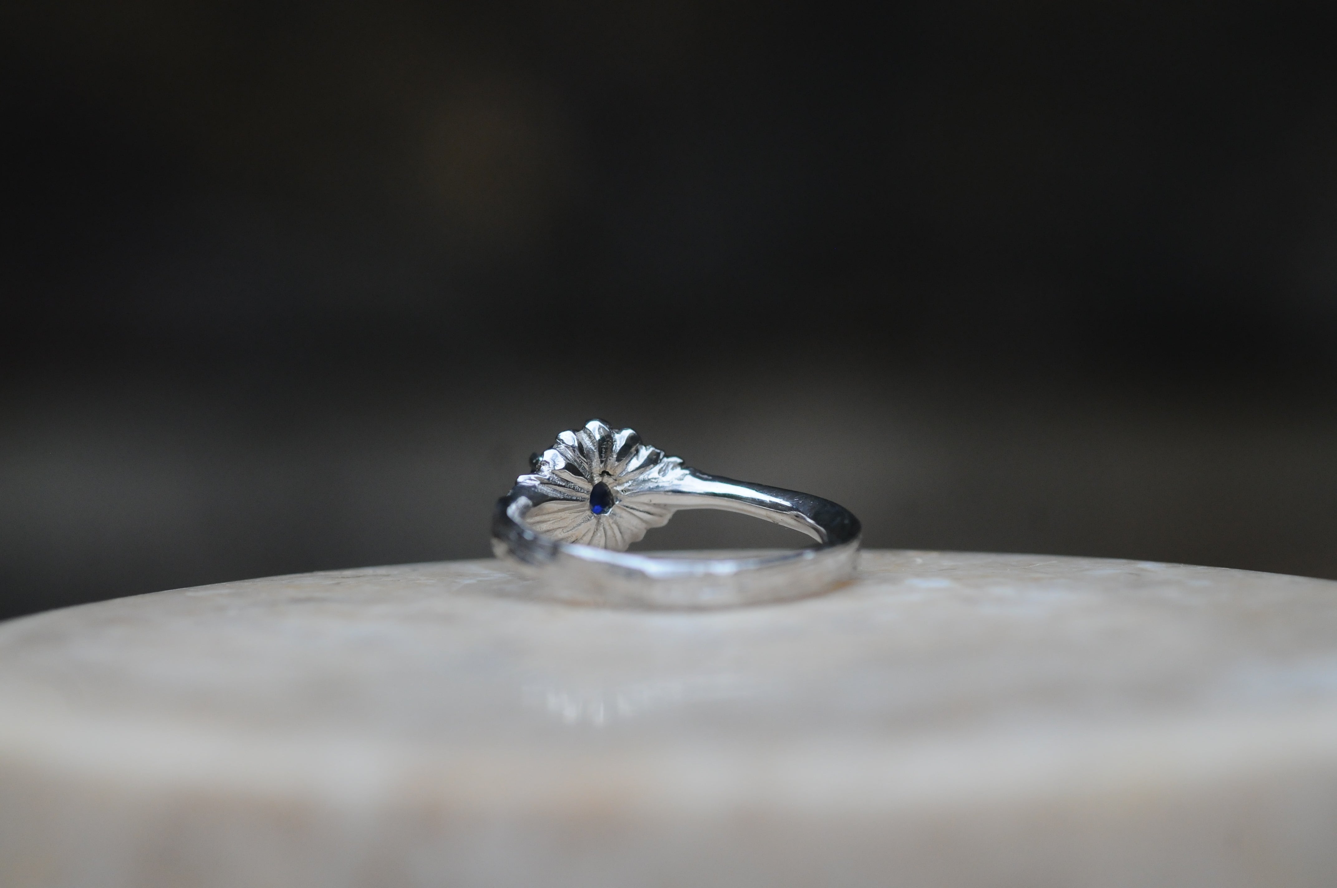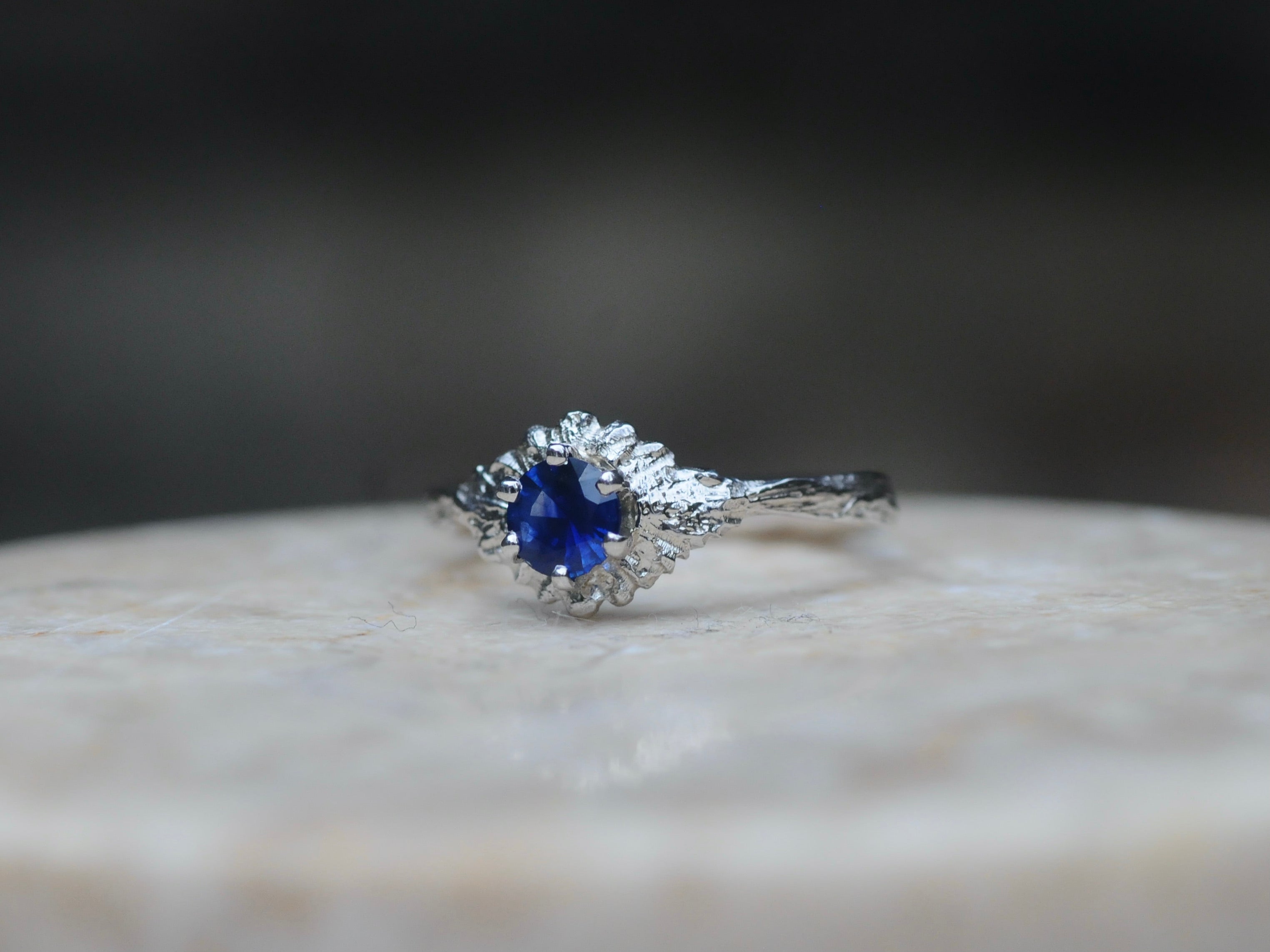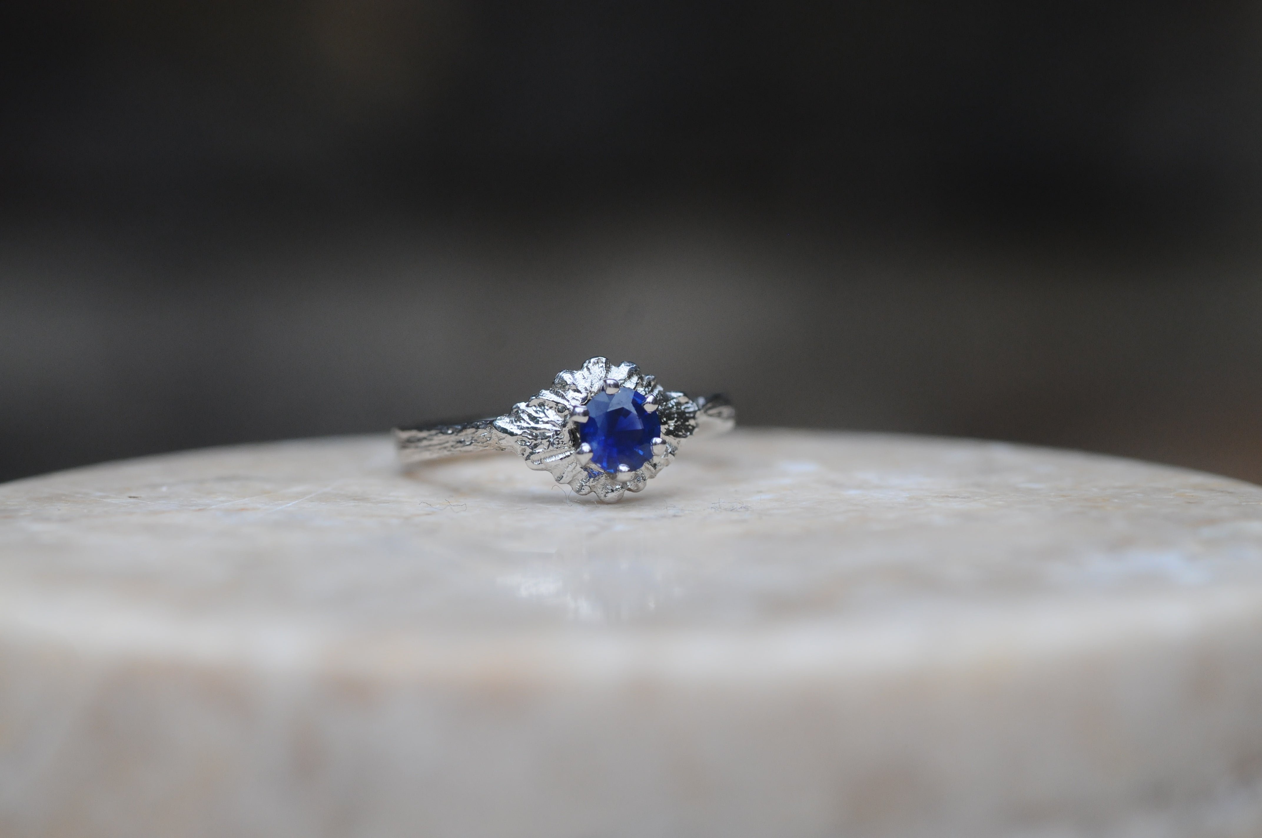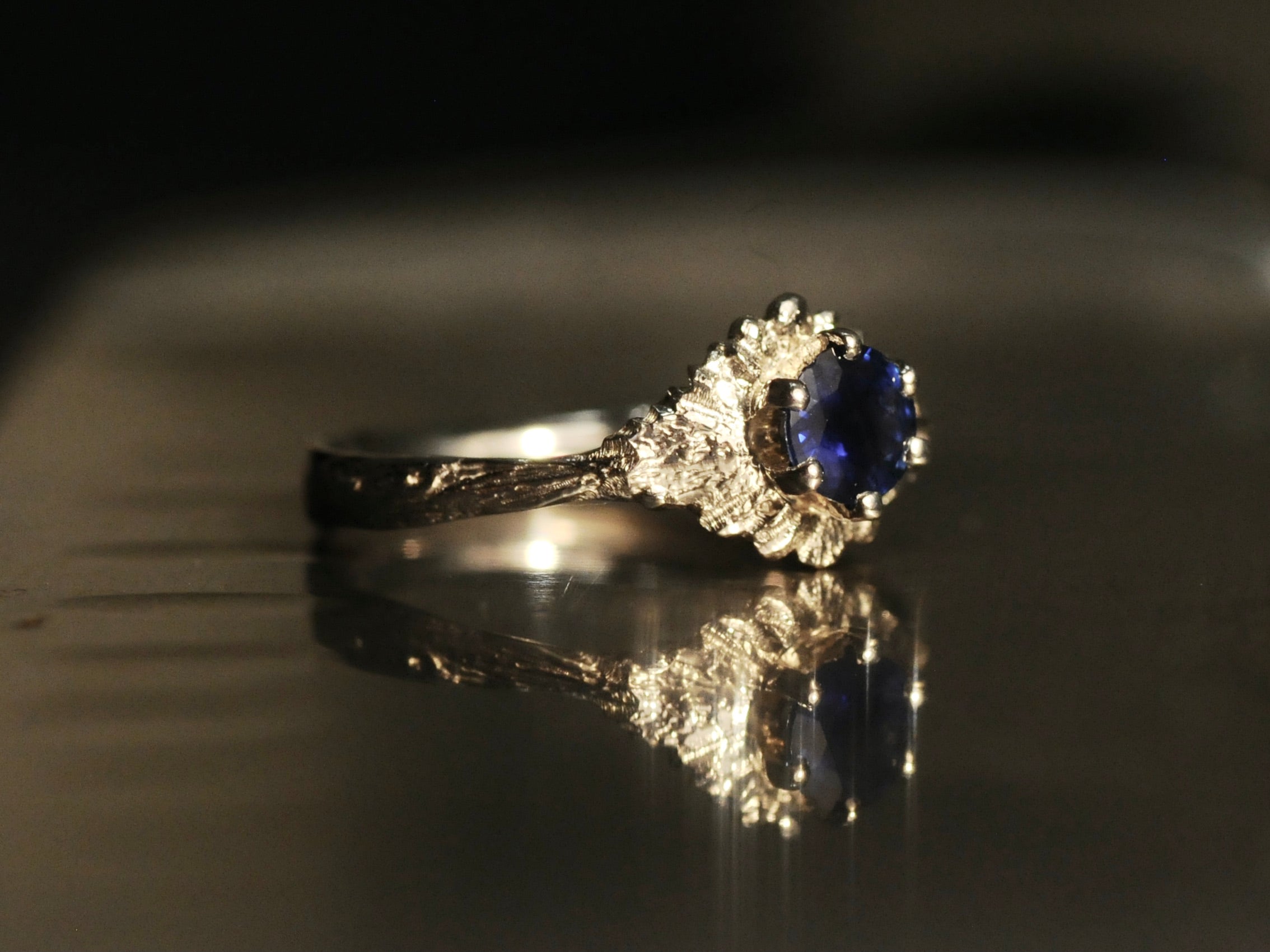 Handcrafted in Fairtrade recycled 9ct white gold, the ring holds a vivid blue sapphire chosen to mirror Charlotte’s eyes. Antique-inspired in form, yet deeply personal in meaning, it captures their unique journey.