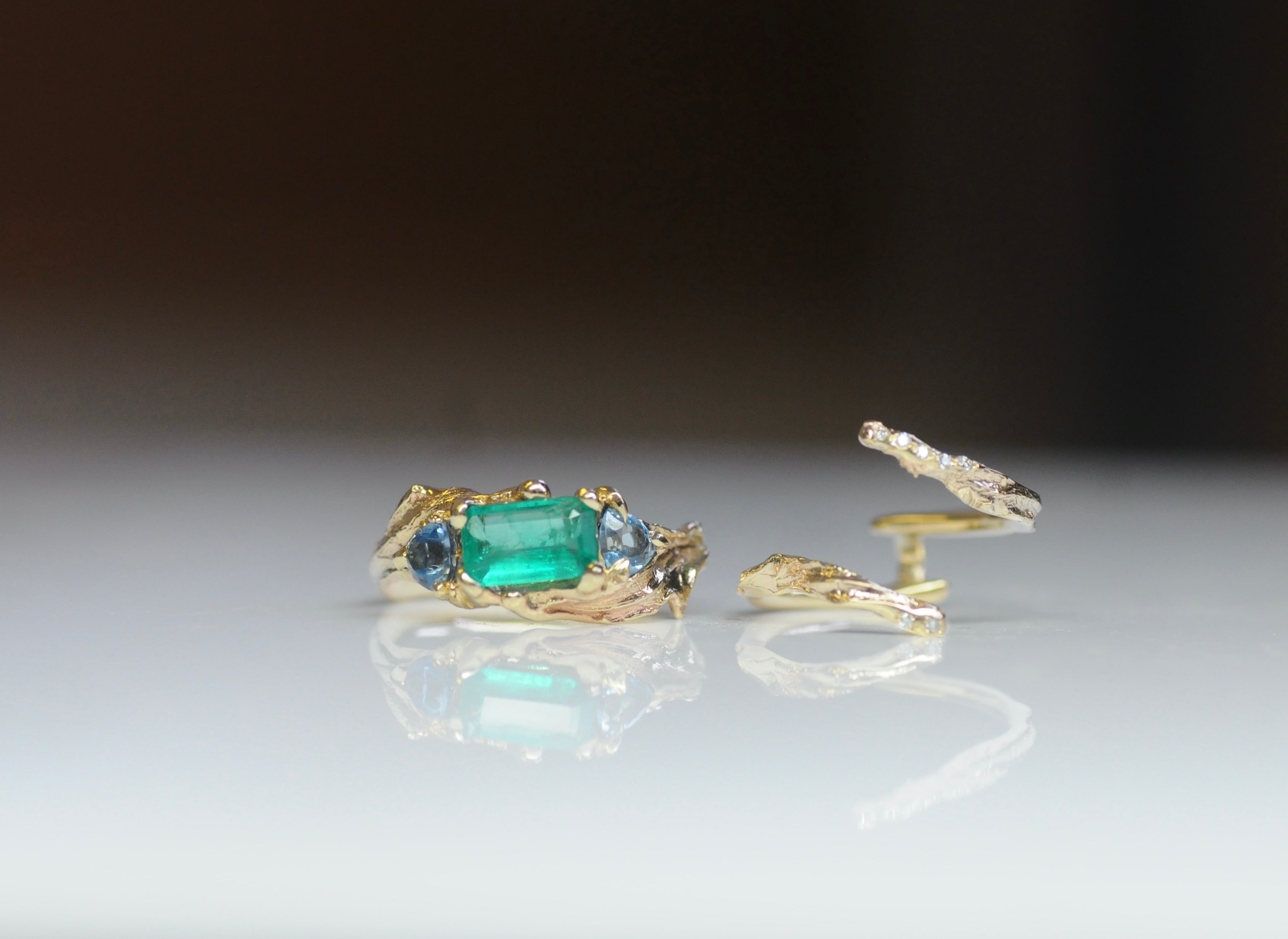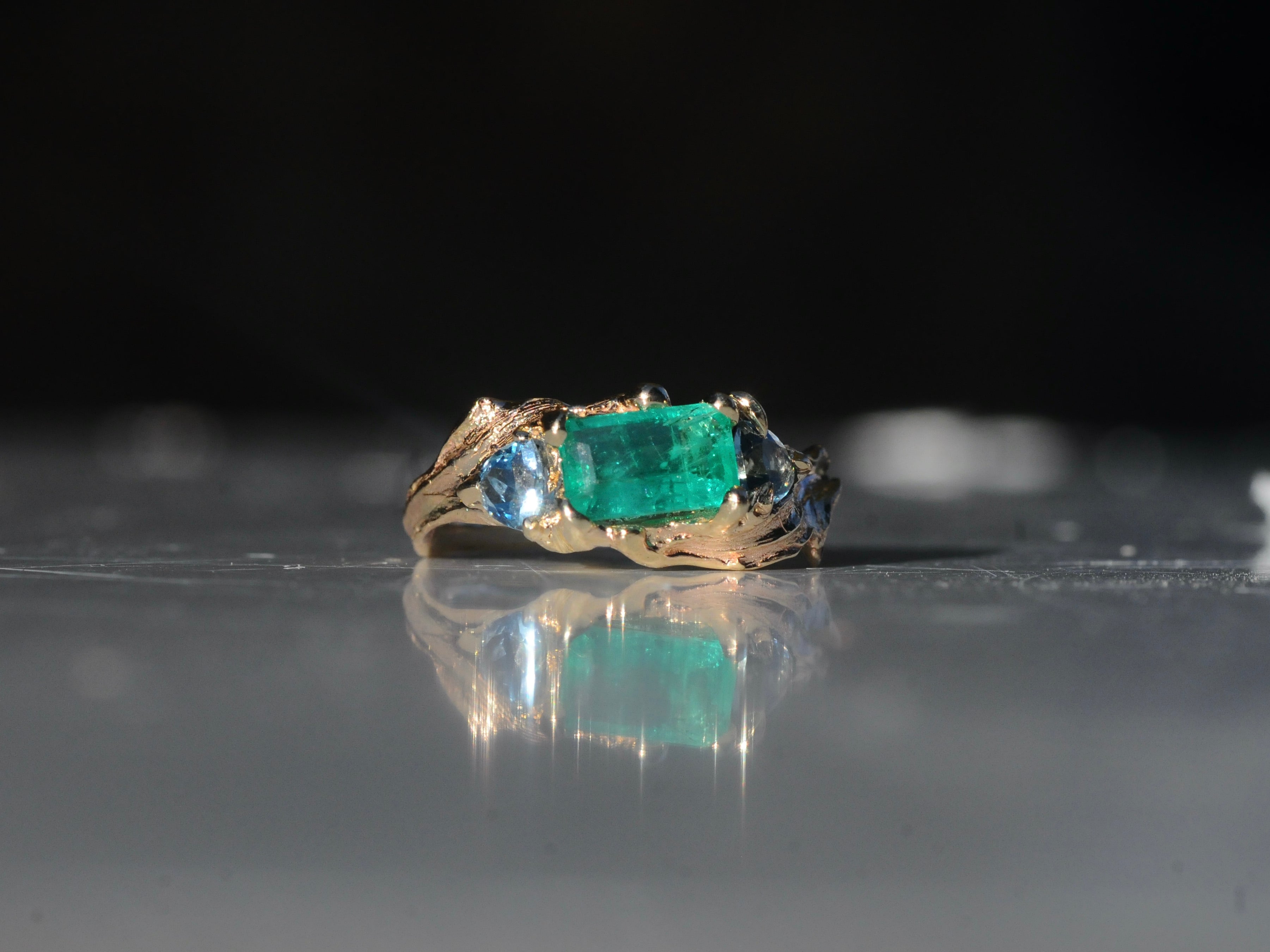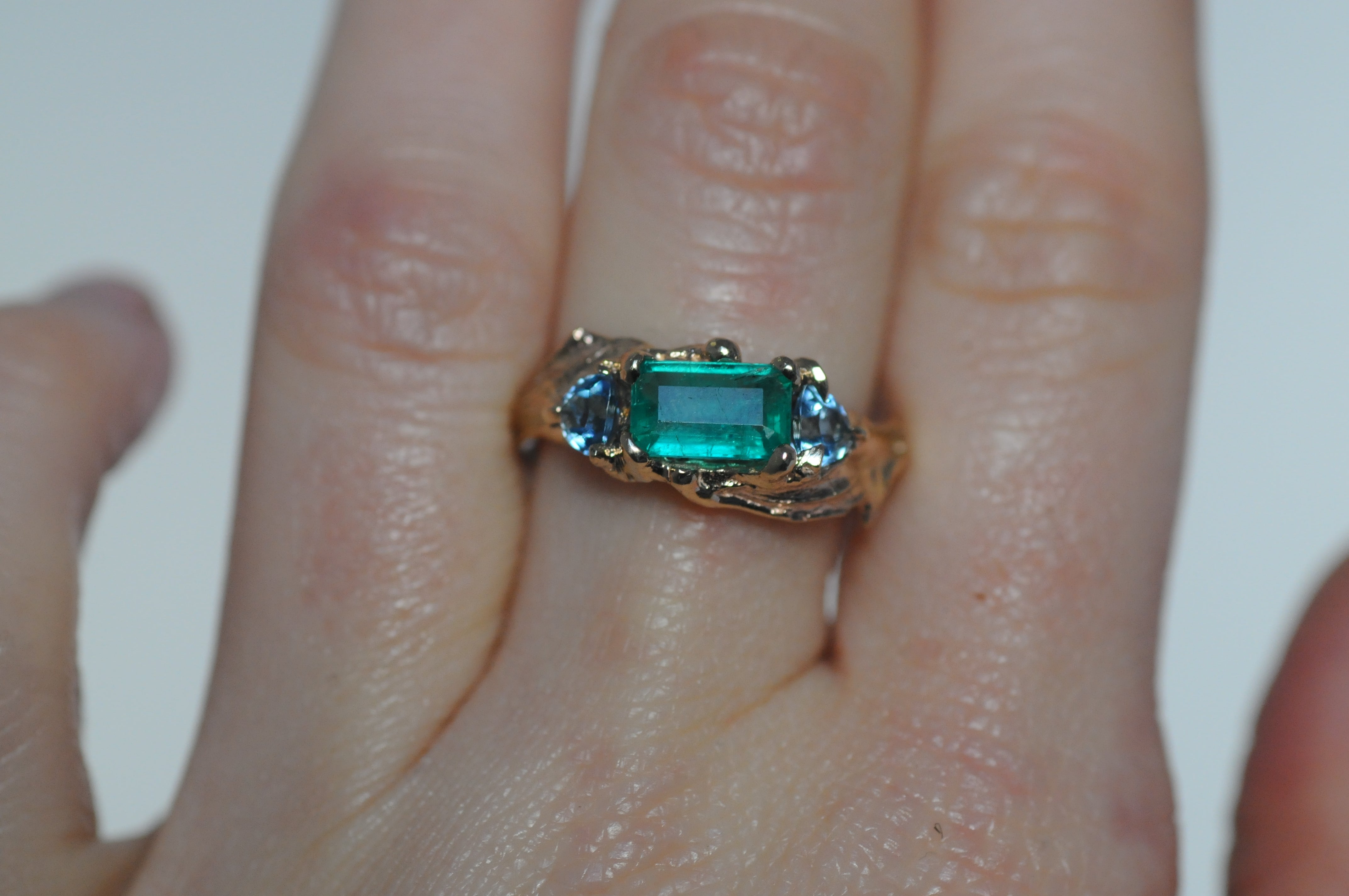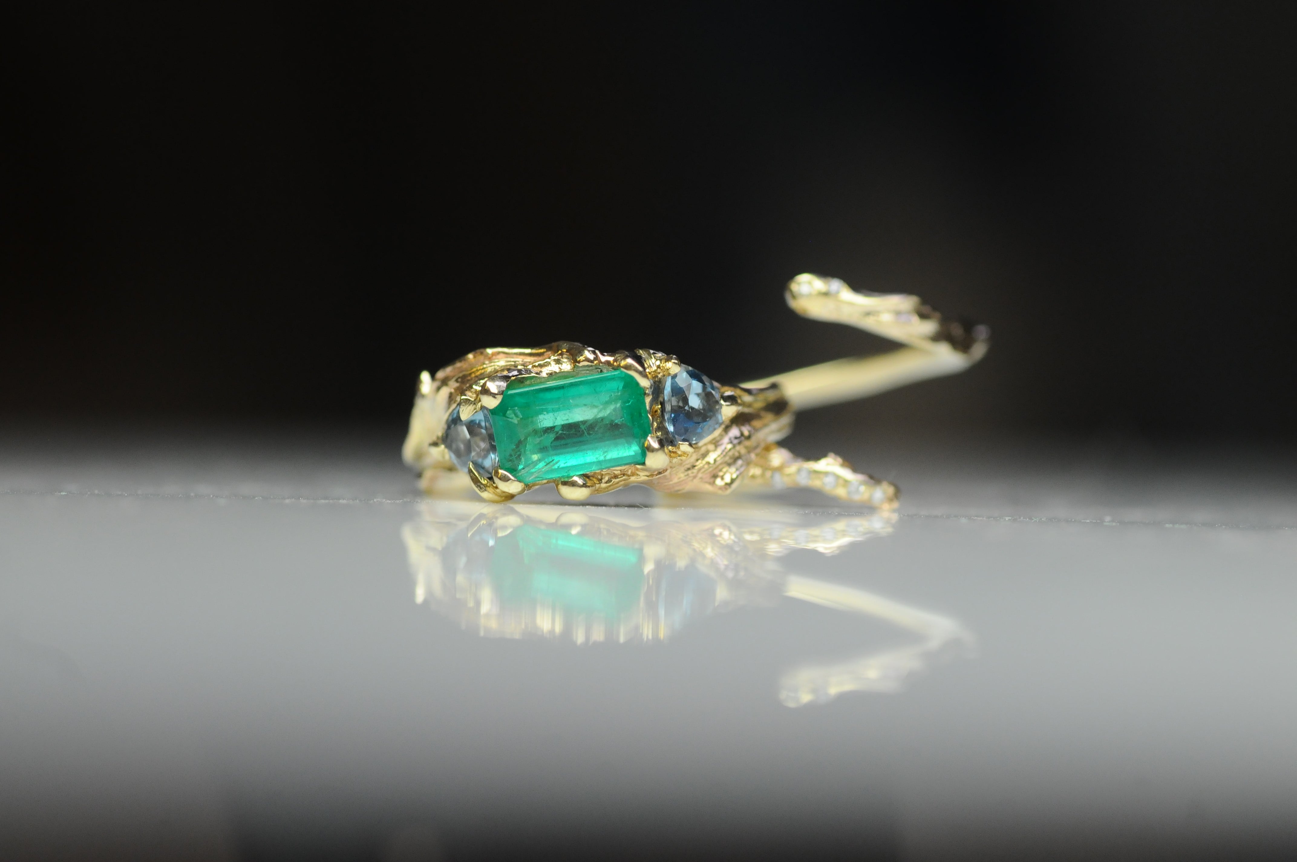 Long, textural blades of thistle leaves curve protectively around a vivid green emerald and two sparkling, baby-blue aquamarines.